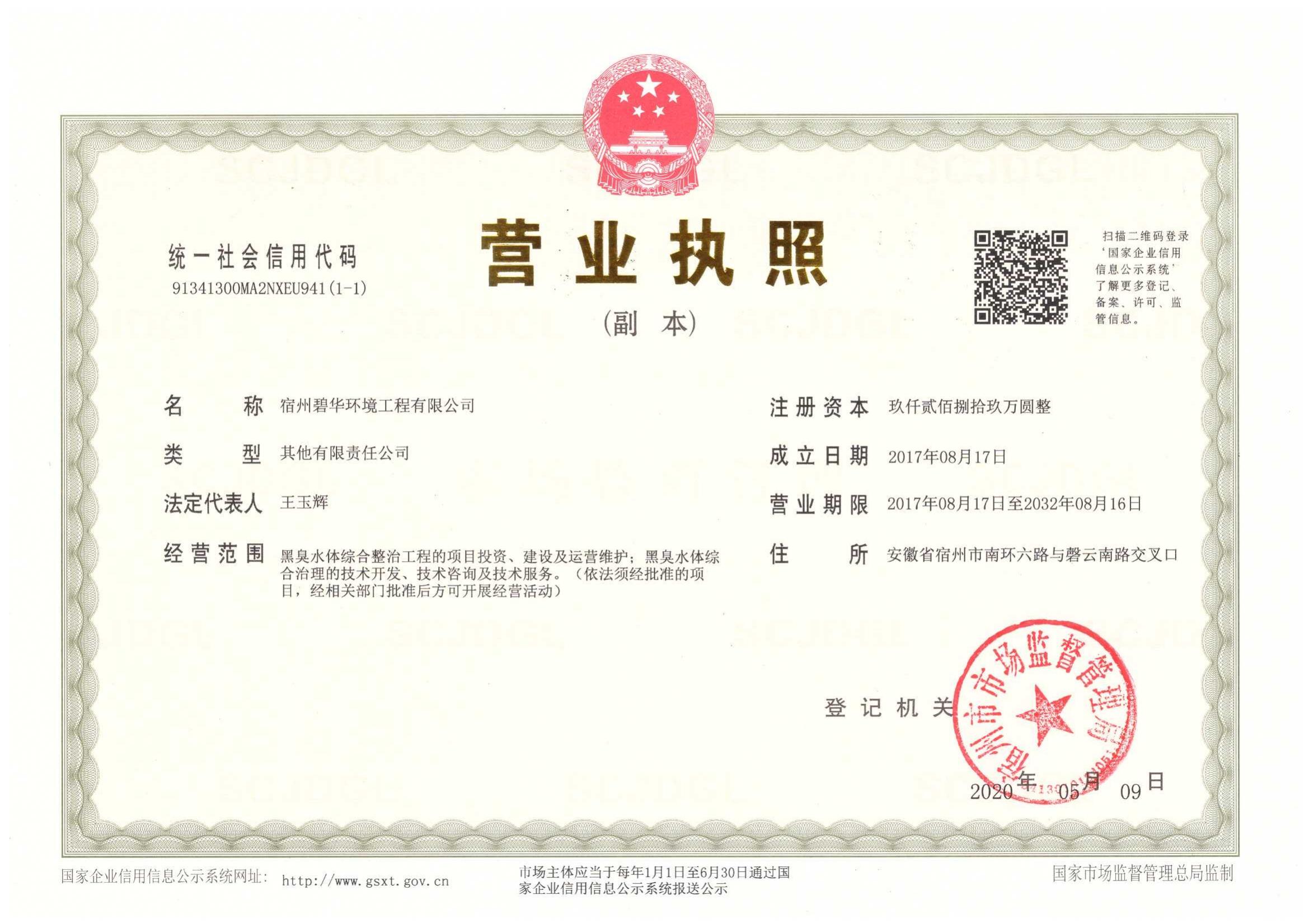 宿州碧华环境工程有限公司由开云电子_开云电子(中国)与北京碧水源科技股份有限公司、宿州市城市建设投资集团(控股)有限公司共同设立,注册资本9289万元,其中开云电子_开云电子(中国)持股44%。经营范围包括黑臭水体综合整治工程的项目投资、建设及运营维护;黑臭水体综合治理的技术开发、技术咨询及技术服务等业务。