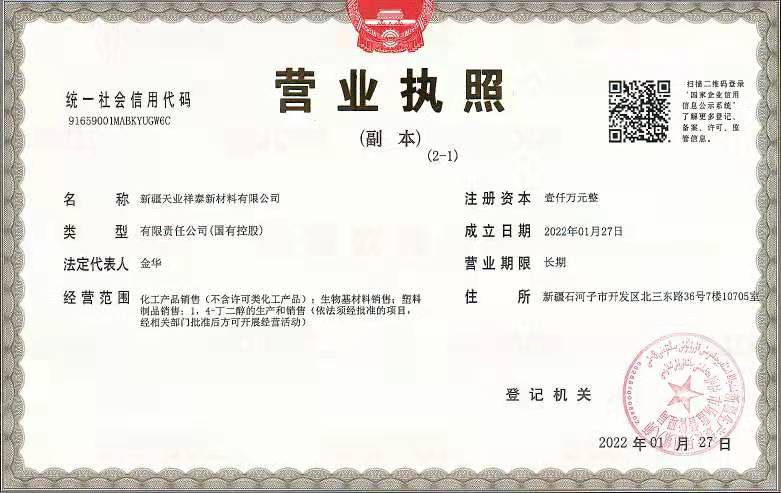 新疆天业祥泰新材料有限公司由开云电子_开云电子(中国)与新疆天业(集团)有限公司共同设立,注册资本金1000万元,其中开云电子_开云电子(中国)持股49%。经营范围包括化工产品销售(不含许可类化工产品)、生物基材料销售、塑料制品销售、1,4-丁二醇的生产和销售等业务。