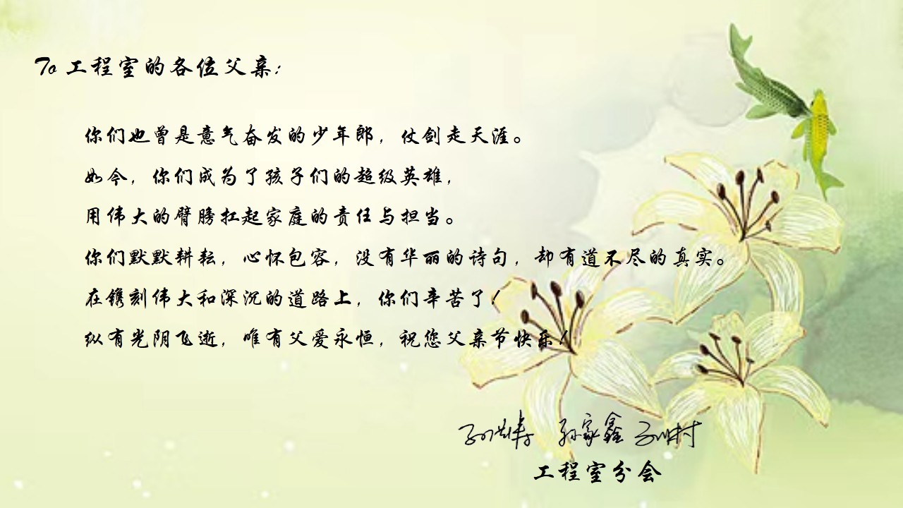 父亲的字典总是写满坚强,流着情长,没有华丽的诗句,却有道不尽的真实。在第112个父亲节来临之际,开云电子_开云电子(中国)工程室分会举办“默默‘父’出致敬父爱”父亲节活动,为分会内辛勤耕耘的父亲们准备了节日的贺卡,送去了温馨的祝福。纵有光阴飞逝,唯有父爱永恒,向每一位伟大而深沉的工程父亲致敬!