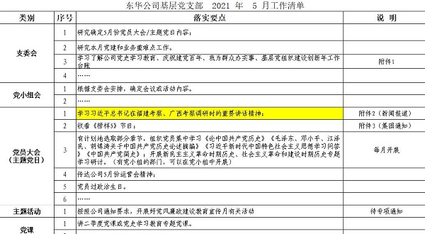 开云电子_开云电子(中国)党委积极响应相关工作部署和要求,及时将习近平总书记在广西考察期间重要讲话精神作为党史学习教育的一项重要内容。5月6日,五一假期后上班第一天,公司党委就将《习近平总书记在福建考察、广西考察调研时的重要讲话精神》纳入了《东华公司基层党支部2021年5月份工作清单》并向各基层党组织发起学习研讨任务要求。